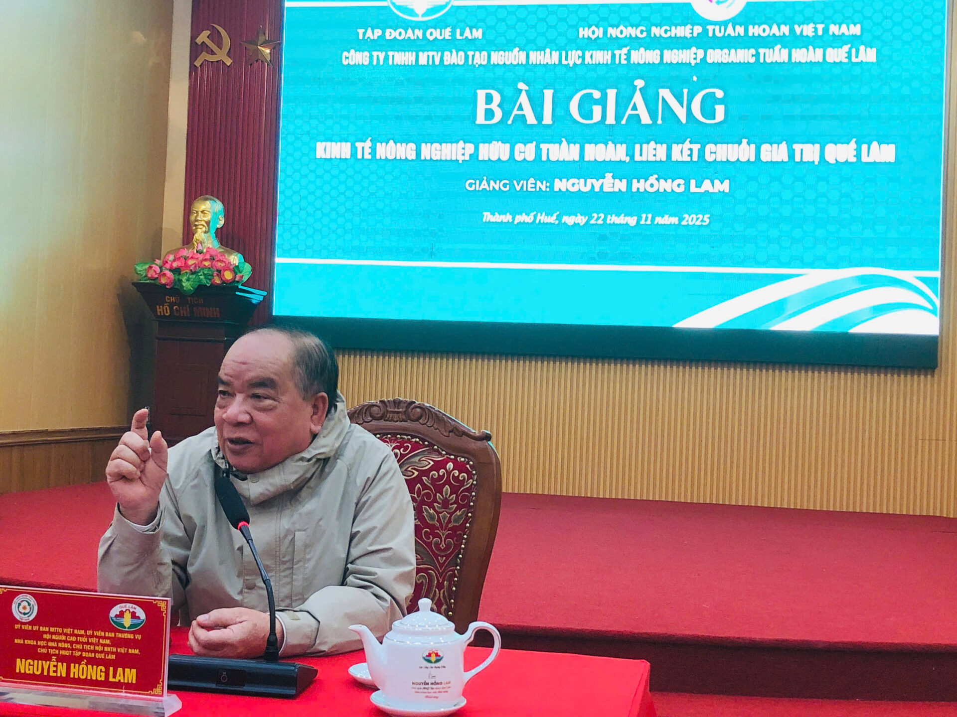 Ngày 22/11/2025, tại 50 Phú Mộng-TP Huế, Hội Nông nghiệp tuần hoàn Việt Nam, Tập đoàn Quế Lâm và Công ty đào tạo nguồn nhân lực kinh tế nông nghiệp Organic tuần hoàn Quế Lâm đã tổ chức lớp đào tạo kiến thức kinh tế hữu cơ tuần hoàn chuỗi liên kết giá trị Quế Lâm cho các học viên TP. Hế và các tỉnh Hà Tĩnh, Quảng Trị.
