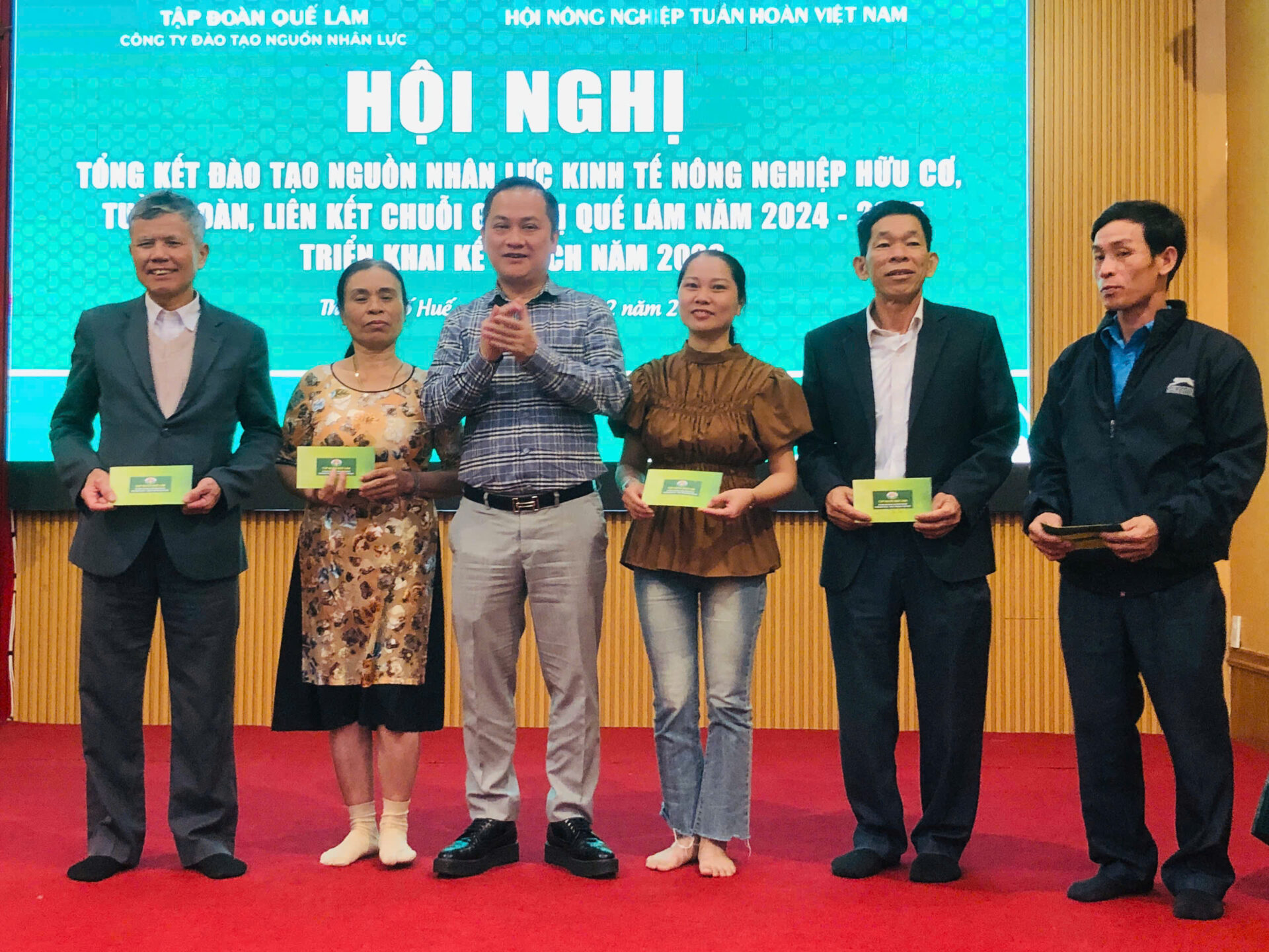 Báo cáo tổng kết của Công ty Đào tạo nguồn nhân lực kinh tế nông nghiệp Organic tuần hoàn Quế Lâm do ông Trương Phước Hiếu – Giám đốc Công ty trình bày nêu rõ: Trước nhu cầu của hàng ngàn hộ nông dân trong cả nước muốn tham gia liên kết chuỗi giá trị Quế Lâm, ngày 22/5/2024, Tập đoàn Quế Lâm đã thành lập Công ty Đào tạo nguồn nhân lực, gồm 3 trung tâm đào tạo ở 3 miền Bắc-Trung-Nam. Đối tượng đào tạo gồm: Cán bộ quản lý Nhà nước; cán bộ khuyến nông cơ sở; các đoàn thể; bà con nông dân có khát vọng làm NNHCTH và các đối tượng khác. Phương châm đào tạo: gắn lý luận với thực tiễn, học đi đôi với hành. Phương pháp đào tạo: nông dân dạy nông dân, người đi trước thành công dạy người đi sau khởi nghiệp. Giáo cụ trực quan là chuồng trại chăn nuôi, vườn cây, cánh đồng. Các học viên tham gia lớp đào tạo “cùng ăn, cùng ở, cùng làm, cùng chia sẻ” về NNHCTH ở các trang trại, gia trại hộ liên kết.