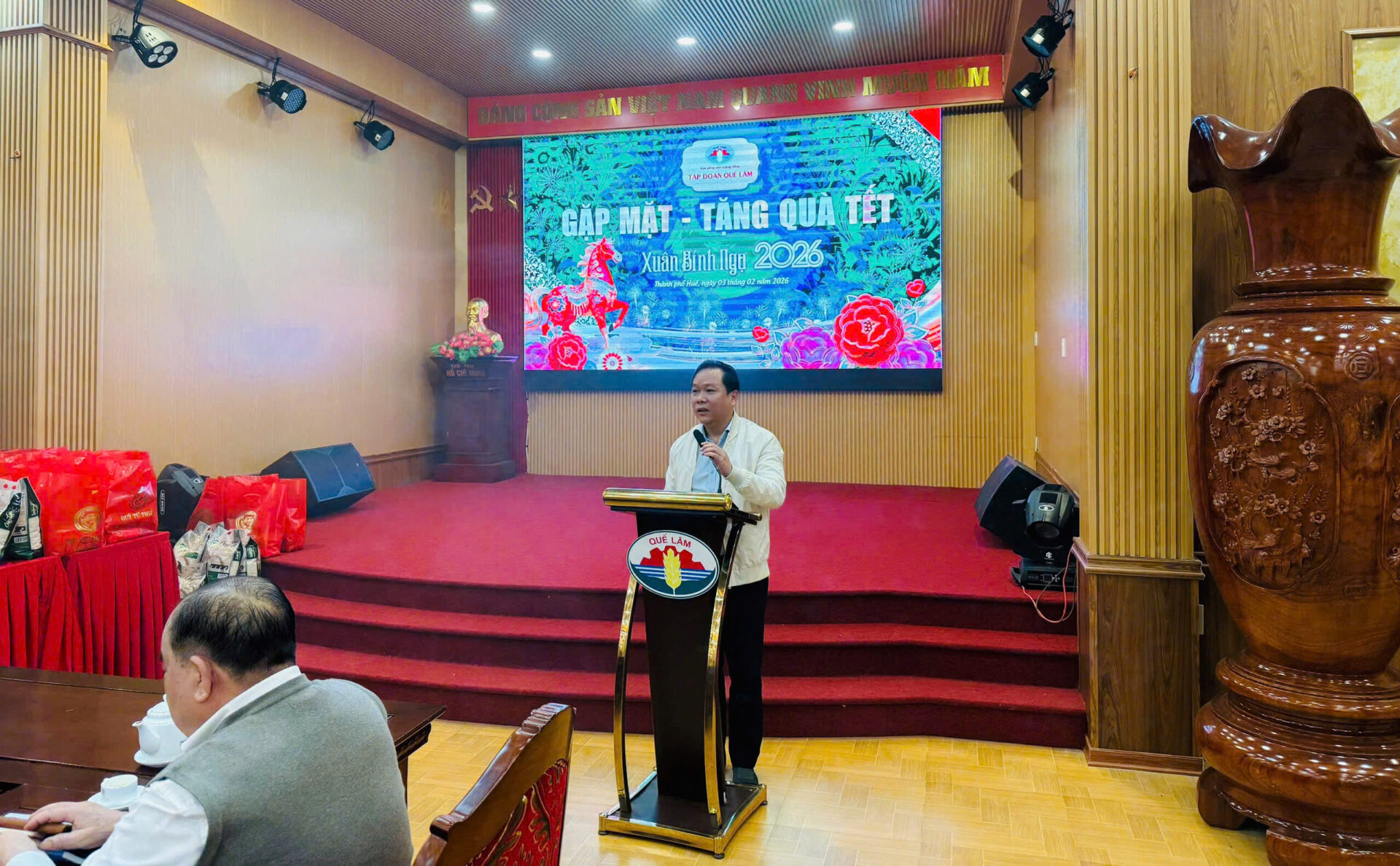 Phát biểu tại buổi gặp mặt và tặng quà Tết, Chủ tịch Tập đoàn Quế Lâm Nguyễn Hồng Lam đã chia sẻ tình cảm và tri ân lãnh đạo các địa phương và bà con nông dân TP. Huế đã chung tay cùng tập đoàn xây dựng, phát triển và lan toả Nông nghiệp hữu cơ tuần hoàn liên kết chuỗi giá trị Quế Lâm. Ông thay mặt Tập đoàn chúc các đồng chí lãnh đạo địa phương và bà con nông dân vui xuân, đón Tết an lành, hạnh phúc.
